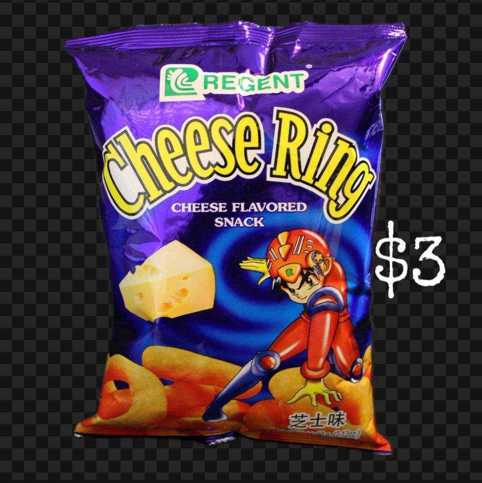 Cheesy, crunchy rings from the Philippines. Bright orange and full of flavor.